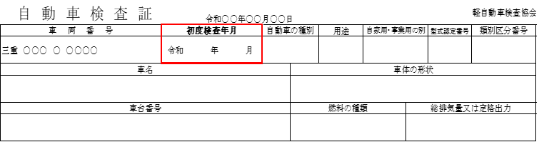 初めて車両番号の指定を受けた月は、車検証の「初度検査年月」欄で確認できます。