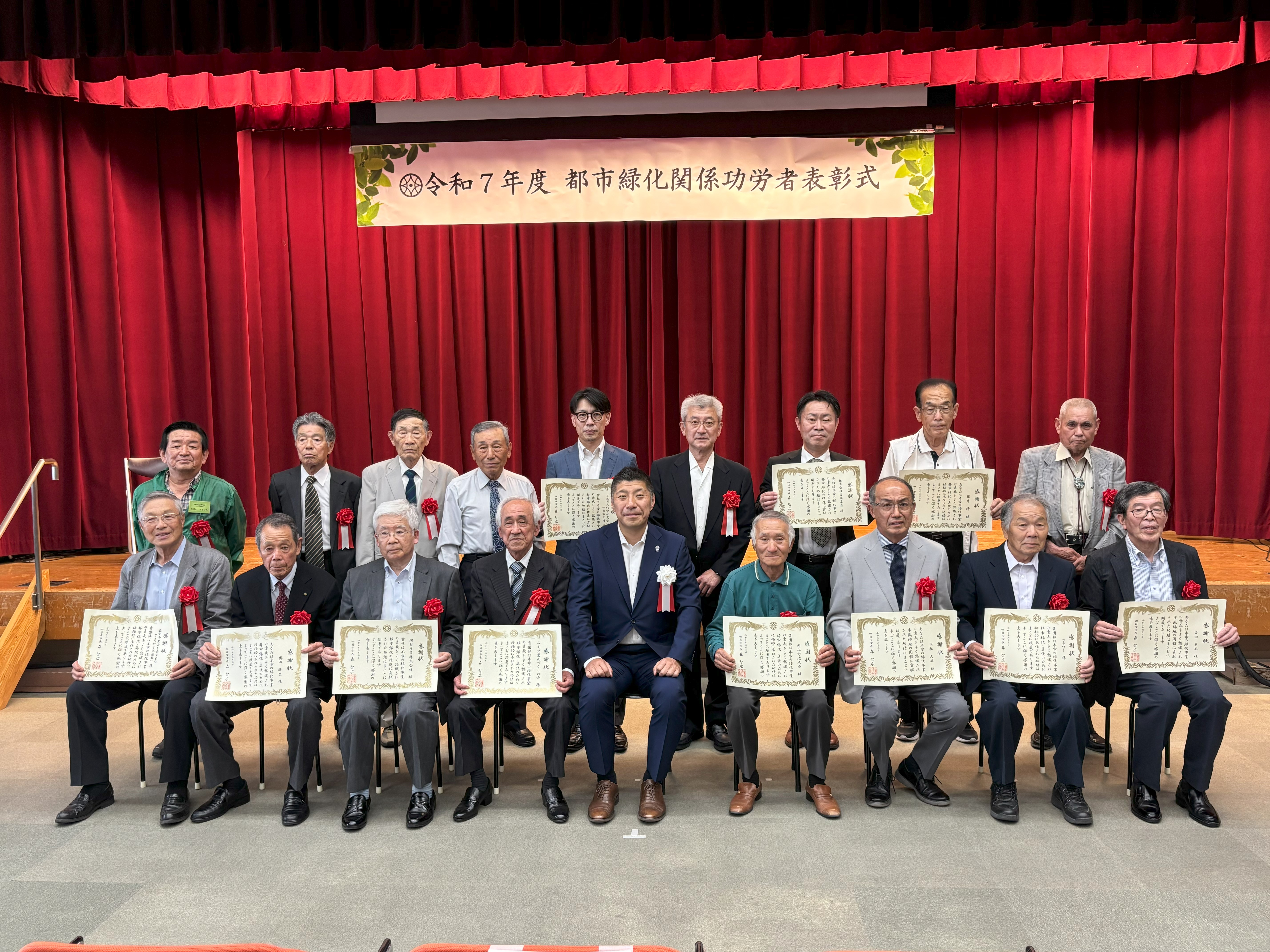 本市では、春季における都市緑化推進運動期間(4/1~6/30)に都市緑化関係功労者表彰を行っています。都市緑化の推進や保全、美化活動に取り組んでおられる個人や団体の表彰を通じ、活動のさらなる発展を願うとともに、市民の皆さんに広く活動を紹介して緑化に対する意識の普及啓発を行うことを目的としており、令和7年度は、令和7年6月2日に開催し、13個人・7団体の表彰を行いました。