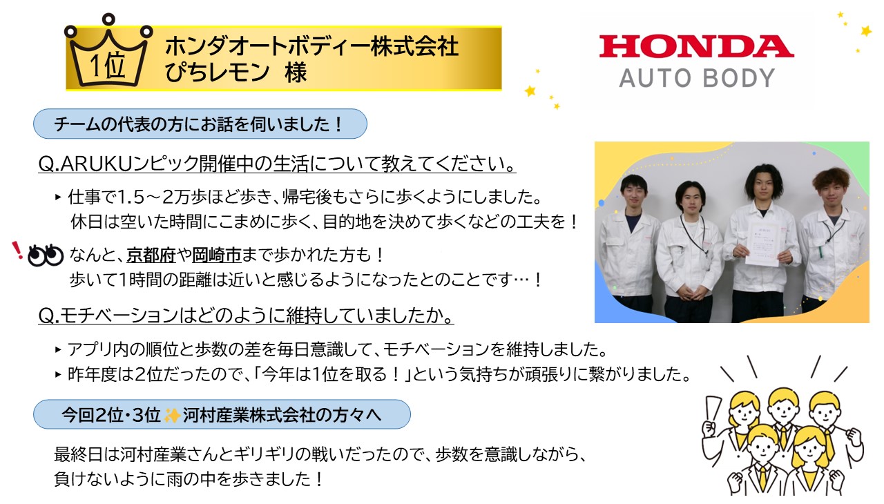 トップ > 市民の方へ > 健康・医療・保健所 > 成人の健康づくり > 健康教室・イベント・四日市市健康マイレージ事業 >令和7年度 企業対抗!四日市をARUKUンピック 入賞チームの取り組みを紹介します!
