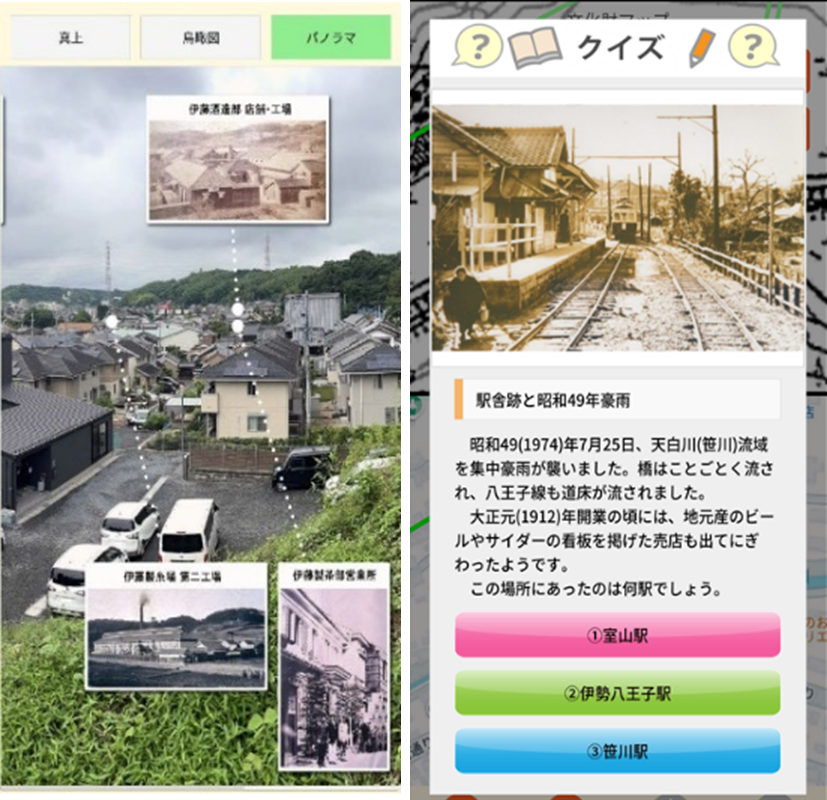 地図画面の中から写真や動画のアイコンを選ぶと、貴重な昔の写真や文化財の情報を見ることができます。